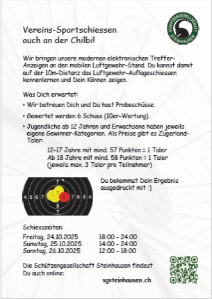 Die Schützengesellschaft Steinhausen bietet Interessierten jeden Alters aus der Region Steinhausen, die Möglichkeit, Schiesssport als Breitensport zu betreiben. Im Mittelpunkt unserer Aktivitäten steht dabei die Freude am Sport und das gemeinsame Miteinander in einem aktiven Vereinsleben. Auf dieser Webseite findest Du alle Informationen zu unserem Verein und unserem Angebot.